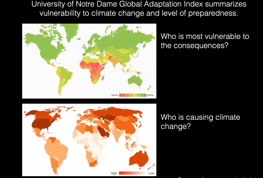 Dr. Turner also brought up the idea of climate justice in regards to climate change. Rising temperatures lead to such things as rising sea levels and more severe storms. The communities most affected by climate change are not usually the communities responsible for most of it.