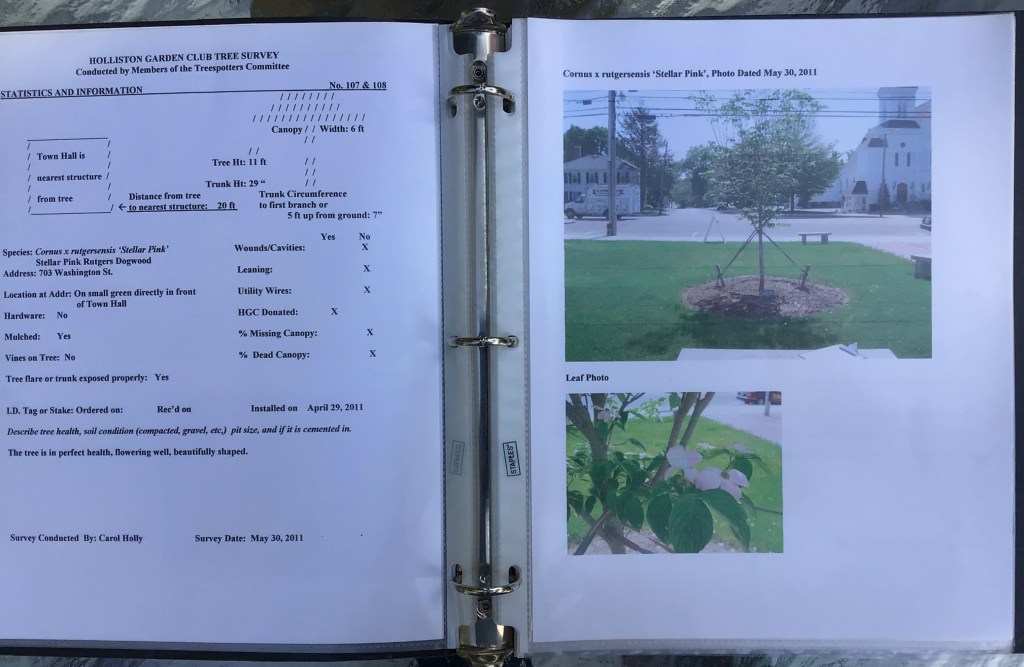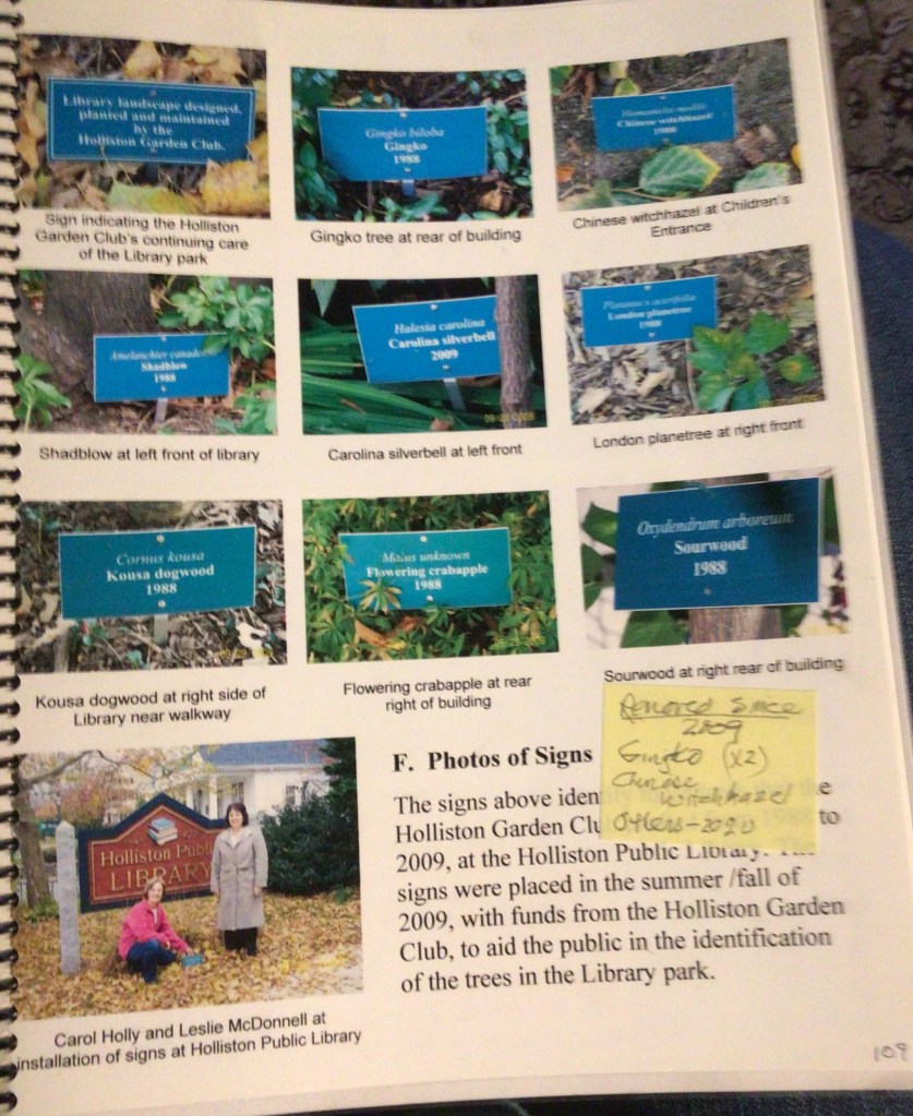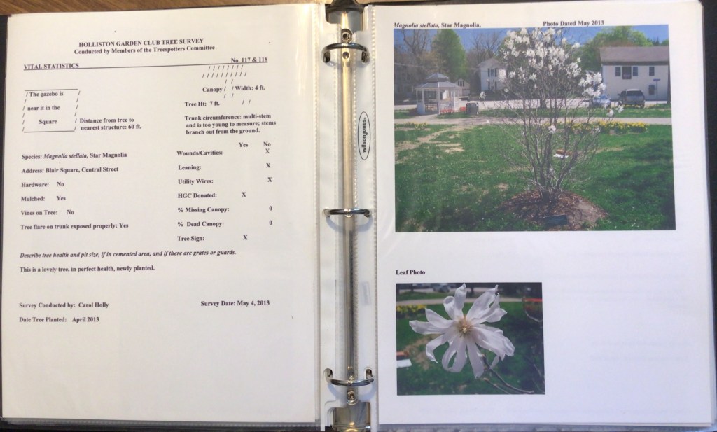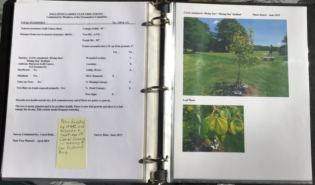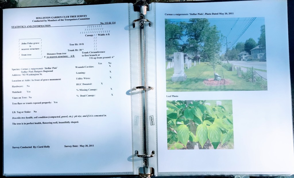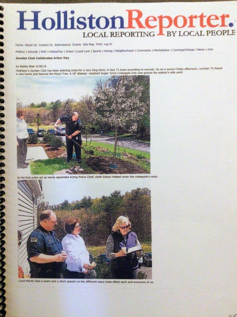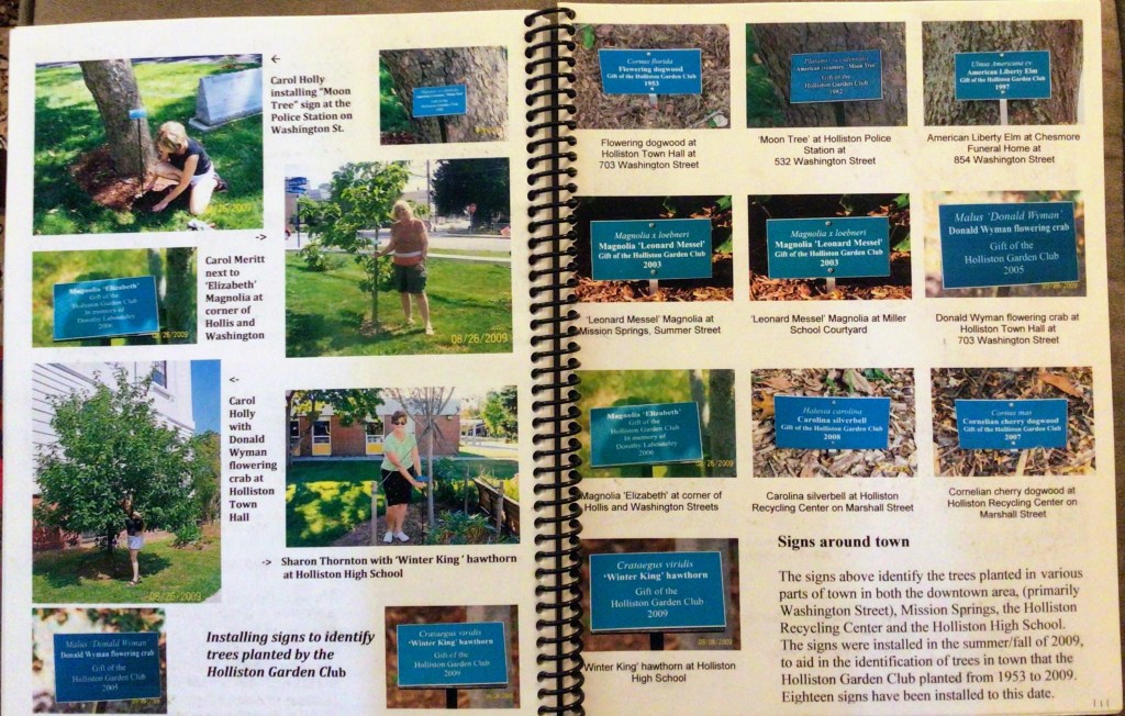 Over the years, the Holliston Garden Club has planted many trees and shrubs throughout our town of Holliston, MA. Our first tree survey was undertaken in 2010 in an effort to identify the many trees planted by the club. After going through club records, over 70 trees were identified, including an American Sycamore called the ‘Moon Tree’, which was planted from a seed that traveled on the Apollo 14 Lunar Mission in 1971 and is located next to the Holliston Police Station. A second tree survey was compiled in 2019 in order to include later planted trees. A few trees have been removed since planting, but many still remain to grace us with their beauty.